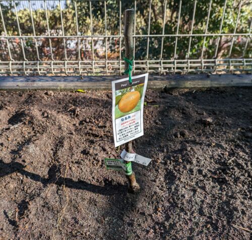 庭にある梅の木を伐採して梨の木を植えることにした。 梨は「なるみ」という品種で、一般的に梨は自家受粉せず受粉樹が必要らしいが、なるみは1本だけで実が付くらしい。