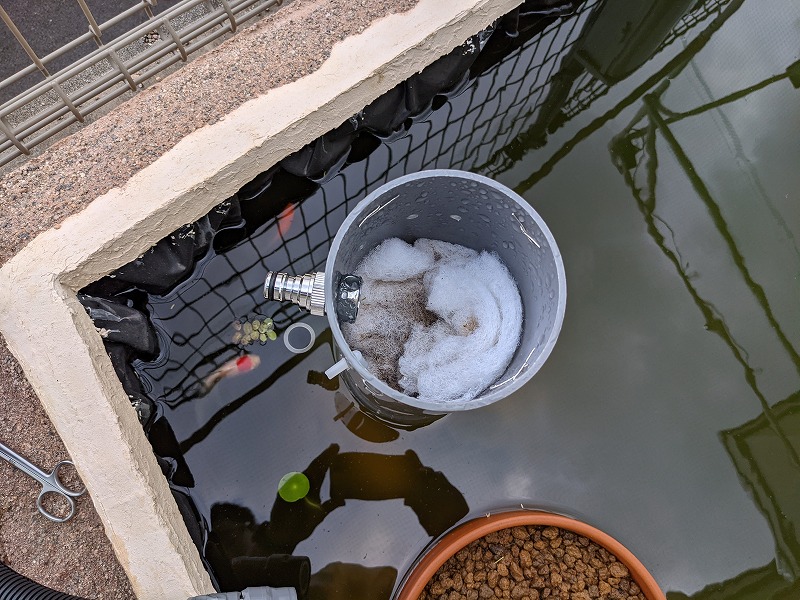 さらに直射日光による劣化防止のためにビニールテープを巻きつけているため、ろ過装置自体を池から取り出そうとするとこれらをすべて外す必要が出てくる。これではメンテナンスが面倒くさくなって、そのうち放置してしまいそうである。